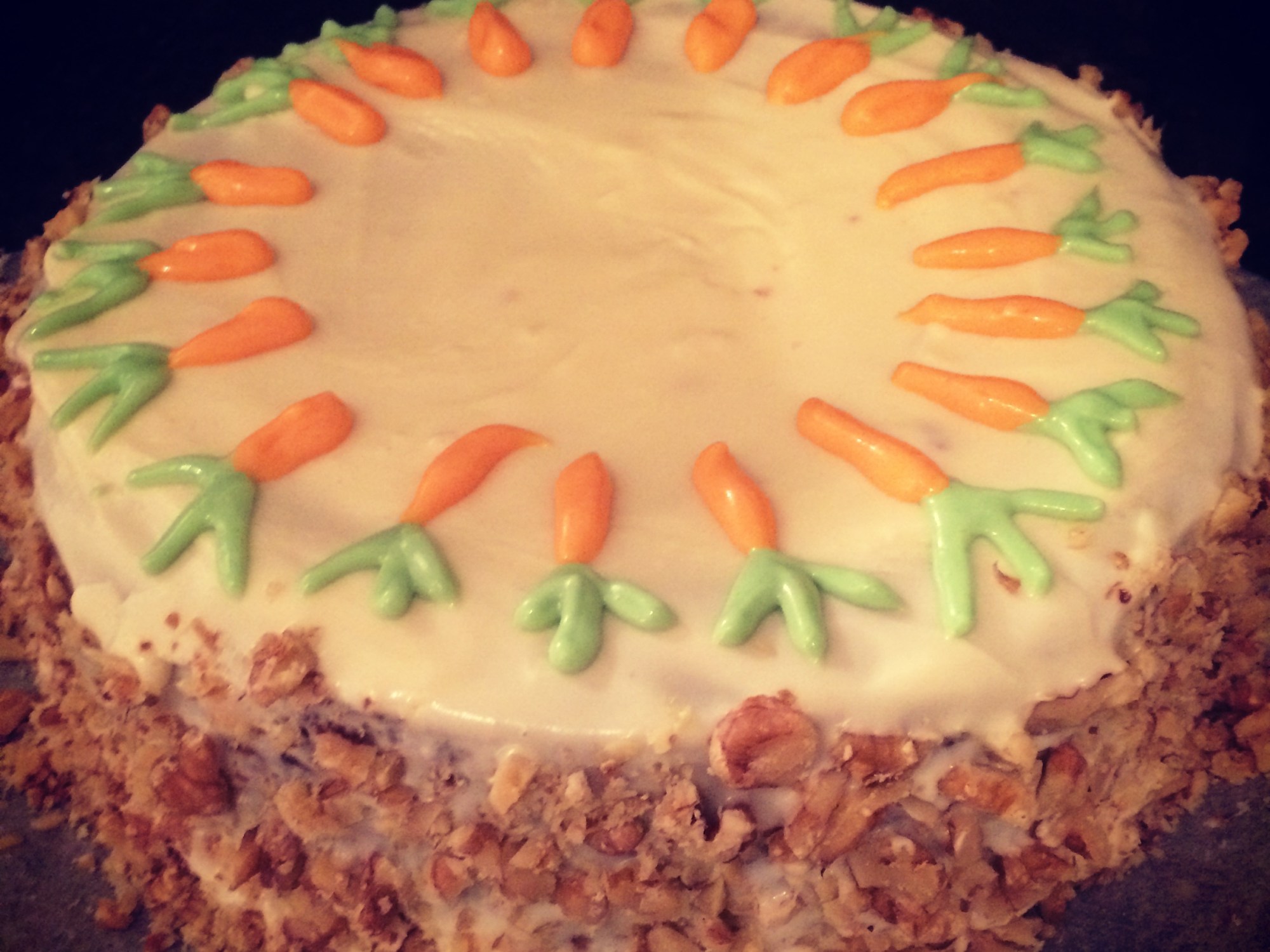 I don’t like to toot my own horn but this carrot cake helped me win an office bake off so toot toot! The recipe came from my mums friend and has been a go to for me. Please don’t laugh at the clearly amateur decorating skills as it was the best I could do – if you don’t want to attempt this you can easily just use the frosting on the top with not carrots or even cover the top with walnuts.